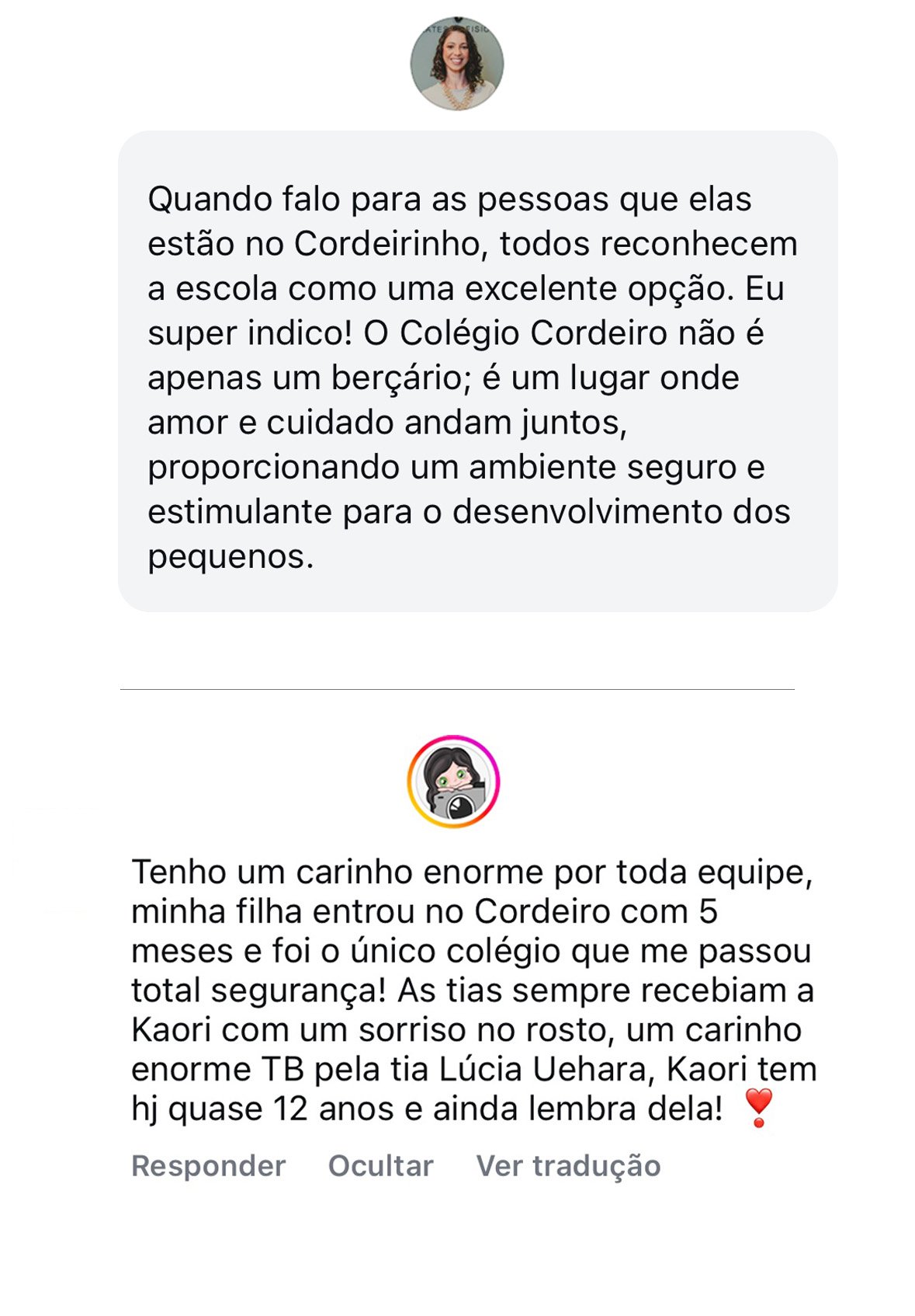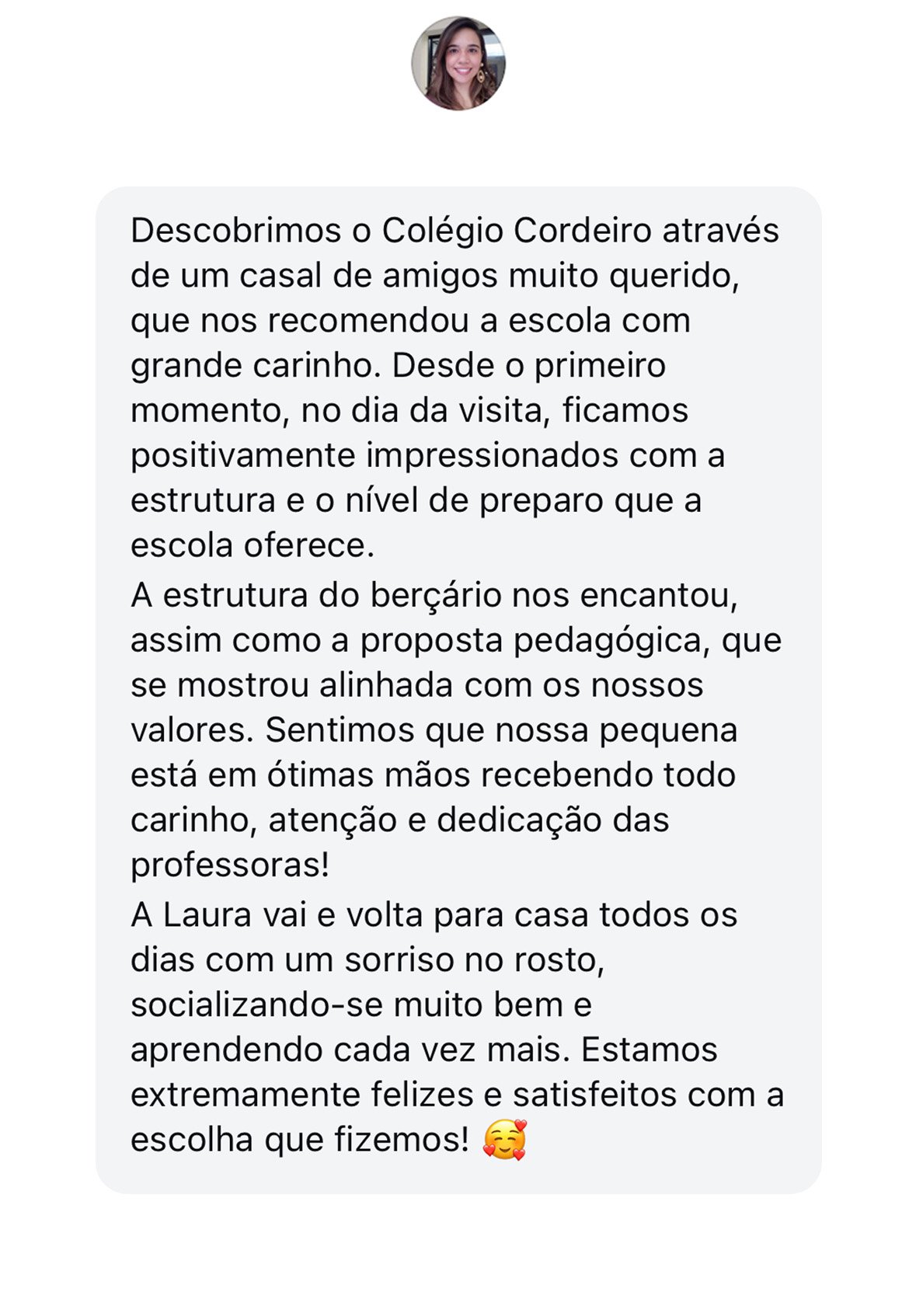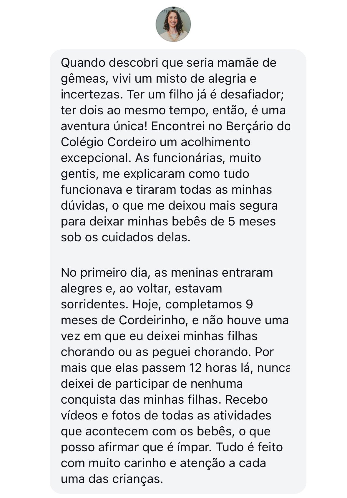 Nada melhor do que ouvir de quem já vivenciou a experiência de ter o filho conosco. Veja o que os pais falam sobre o Berçário do Colégio Cordeiro: