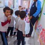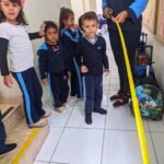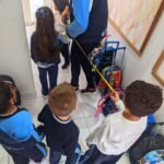 Para investigar, a prô Lari convidou a turma para medir a escola, com ajuda da trena, descobriram que a baleia é maior que a escola.