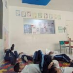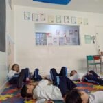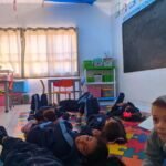 As crianças apreciaram deitadas no tapete, ouvindo o som que as baleias fazem no fundo do mar.Após saber que a baleia-azul é o maior animal do planeta, uma das crianças levantou um questionamento.